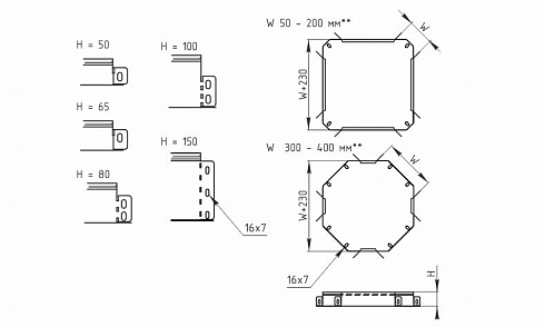 Ширина W = 100 / 150 / 200 / 300 / 400 / 500 / 600 мм.