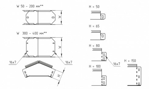 Ширина W = 100 / 150 / 200 / 300 / 400 / 500 / 600 мм.